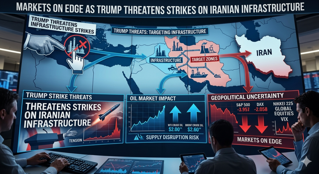 वैश्विक वित्तीय बाजारों में अनिश्चितता का माहौल गहराता जा रहा है, जब Donald Trump ने ईरान के महत्वपूर्ण बुनियादी ढांचे पर संभावित हमलों की चेतावनी दी। उनके इस बयान के बाद निवेशकों में चिंता बढ़ गई है और बाजारों में उतार-चढ़ाव तेज हो गया है।
